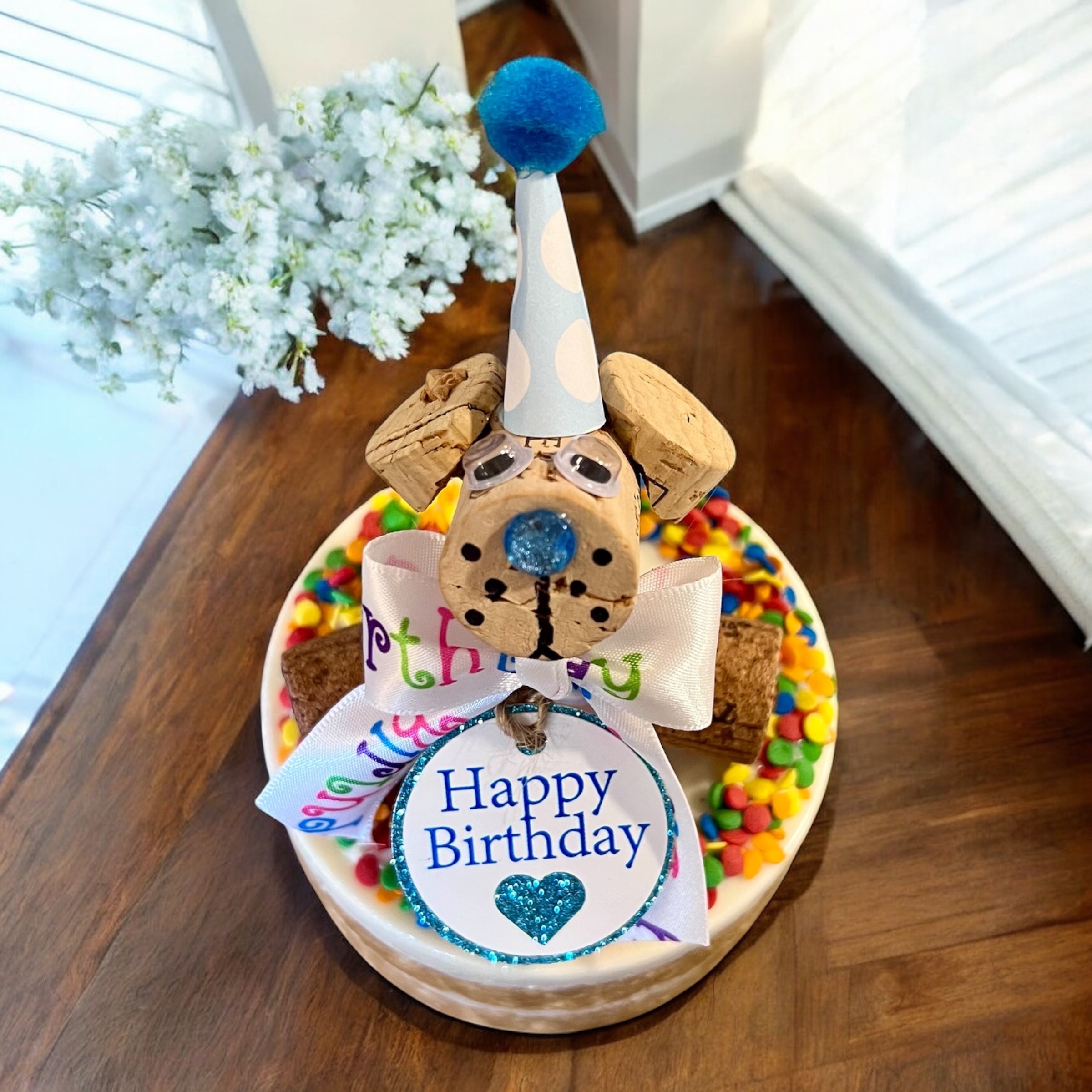Note*: Comes with Topper, Package Bag and bow.  You must assemble the packaging.  Square packaging for Printed Toppers and Round packaging for Cork Dog Toppers.